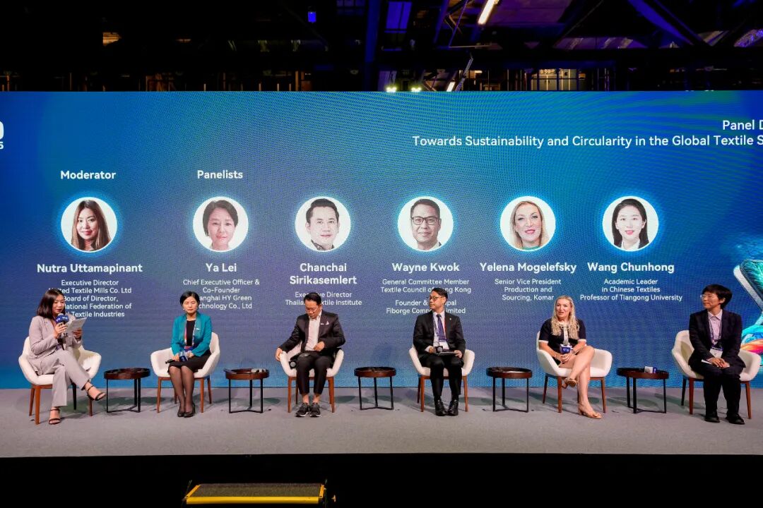 ![]() 随后,两场专题讨论先后举行。“专题讨论1:纺织全球供应链的可持续与循环之路”汇聚了上海合源环境科技有限公司总经理亚蕾,泰国纺织研究院执行董事Chanchai Sirikasesemler,Fiborge Company Limited董事Wayne Kwok,Komar Brands生产与采购高级副总裁Yelena Mogelefsk,天津工业大学教授、博士生导师王春红五位嘉宾,围绕各国法律法规对可持续发展的相关规定、在供应链各环节如何合作实现绿色发展等问题展开讨论,从政府、生产商、采购商、院校等角度,交流各自看法和经验,他们一致认为,产业的可持续需要通过供应链各环节的通力合作得以实现。该环节由United Textile Mills Co.Ltd执行董事、泰国纺织⼯业联合会国际事务秘书⻓Nutra Uttamapinant主持。