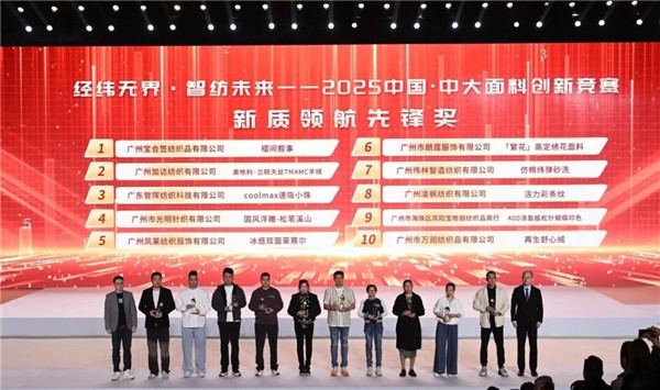 新质领航先锋奖甄选“行业翘楚” 2025中国·中大面料创新竞赛紧扣行业新定位,设材料创新奖、工艺创新奖、设计创新奖、绿色创新奖四大专业赛道。 竞赛自今年9月启动征集,由中国针织工业协会、中国服装协会、北京服装学院专家及“金顶奖”设计师组成的权威评审团,从众多参赛作品中严苛甄选出40款优秀面料分别获得材料创新奖、工艺创新奖、设计创新奖以及绿色创新奖。后经知名服装品牌设计总监、专业买手组成的评审团对获奖面料进行二次投票,最终选出10款面料获得新质领航先锋奖。