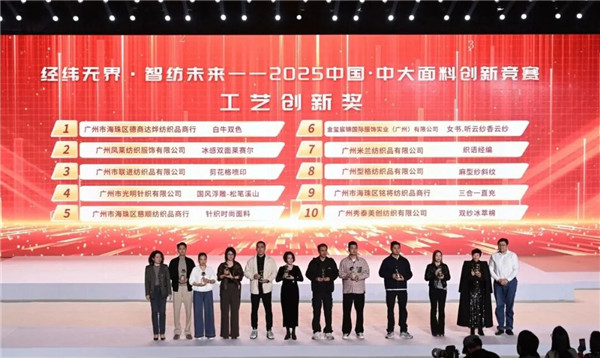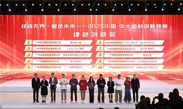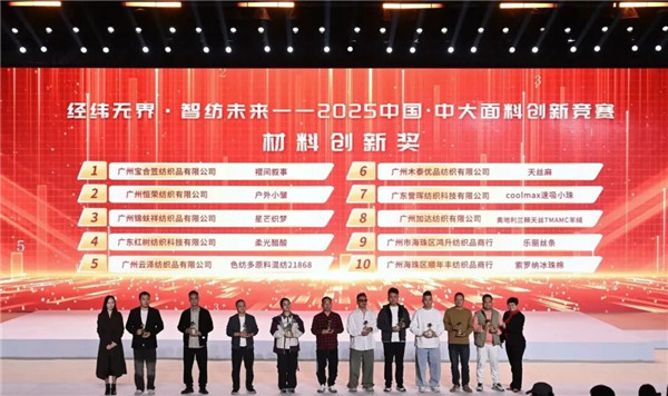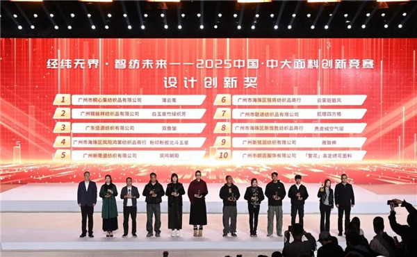 11月29日,2025中国·中大面料创新竞赛颁奖仪式在广州隆重举行。 2025中国·中大面料创新竞赛由中国纺织工业联合会、广州市海珠区人民政府指导,中国纺织工业企业管理协会、广州市海珠区中大国际创新生态谷纺织产业联合会联合主办,并得到了中国纺织工业联合会流通分会、广州市海珠区科技工业商务和信息化局、广州市海珠区凤阳街道办事处、广州市海珠区新港街道办事处和广州市海珠区瑞宝街道办事处的大力支持。活动以“经纬无界・智纺未来”为主题,不仅是对中大纺织商圈年度面料创新成果的一次集中检阅,更是广州海珠区锚定“人工智能+现代纺织”战略定位,推动中大纺织商圈从传统“集散地”向科创“策源地”跨越的重要里程碑。 中国纺织工业联合会秘书长夏令敏,中国纺织工业联合会流通分会会长徐建华,中国纺织工业联合会流通分会副会长、中国纺织工业企业管理协会副会长兼秘书长王水元,广州市商务局副局长罗政,广州市工信局副局长黄星耀,广州市海珠区副区长陈宇,广州市海珠区科技工业商务和信息化局局长麦锰锰等领导出席了颁奖仪式。