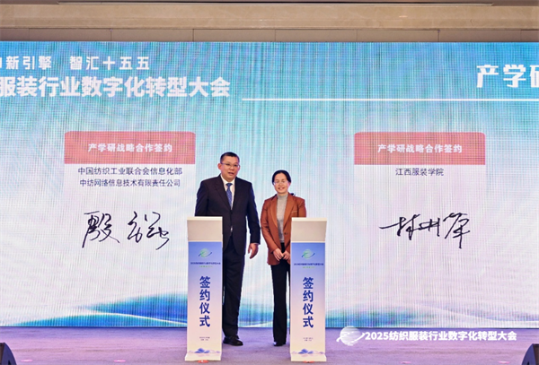 中国纺织工业联合会信息化部主任、中纺网络信息技术有限责任公司董事长殷强与江西服装学院党委书记林井萍进行产学研战略合作签约