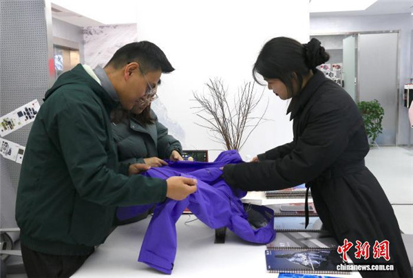 12月24日,采购商仔细查看冲锋衣样衣。中新社记者 项菁 摄