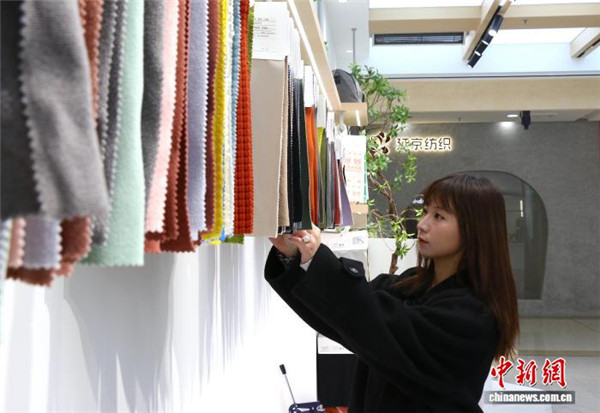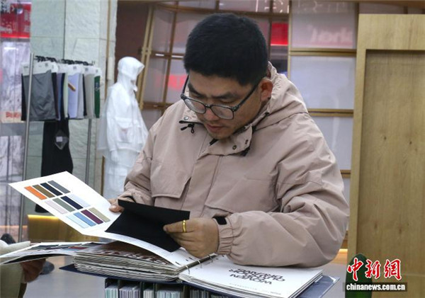 12月24日,采购商仔细挑选冲锋衣面料样品。中新社记者 项菁 摄