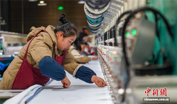 1月9日,贵州省从江县贯洞镇美娥社区一家刺绣生产车间,工人在赶制刺绣订单产品。新年伊始,从江县境内的各家企业纷纷铆足干劲赶进度,开足马力赶订单,冲刺首季“开门红”。卢忠南 摄