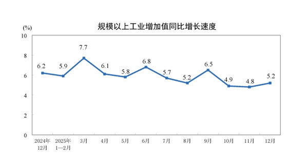据国家统计局网站消息,2025年12月份,规模以上工业增加值同比实际增长5.2%(增加值增速均为扣除价格因素的实际增长率)。从环比看,12月份,规模以上工业增加值比上月增长0.49%。2025年,规模以上工业增加值比上年增长5.9%。