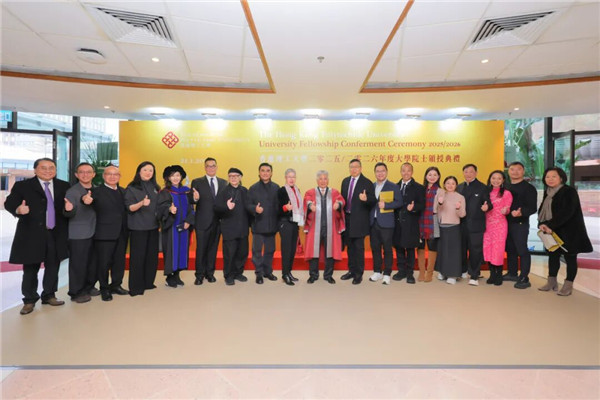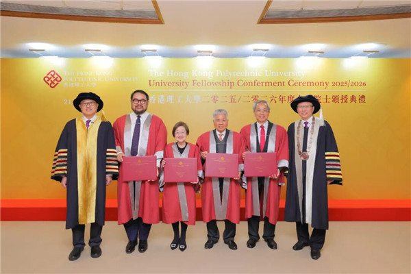 香港理工大学举行大学院士颁授典礼,校董会主席林大辉博士(左一)和校长腾锦光教授(右一)欢迎四位新任大学院士:陈淑玲女士(左三)、梁甜昭教授(右二)、伍尚匡先生(左二)及杨勋先生(右三)加入理大家庭。 香港理工大学于2026年1月21日举行2025/2026年度大学院士颁授典礼,表彰4位对社会及大学发展作出杰出贡献的领袖人士。其中,旭日集团副董事长兼总经理、香港纺织商会会长杨勋先生,凭借其在企业发展、教育推广及慈善服务方面的卓越成就,获颁大学院士荣衔,成为瞩目焦点。 杨勋先生为香港著名企业家,一直致力推动时装及纺织业发展。他热心公益,长年支持社区及教育项目,尤以对香港理工大学的贡献尤为显著。他积极促进学术界与产业界的合作,推动应用研究及人才培育,对理大纺织及服装学院的发展作出重大贡献。
