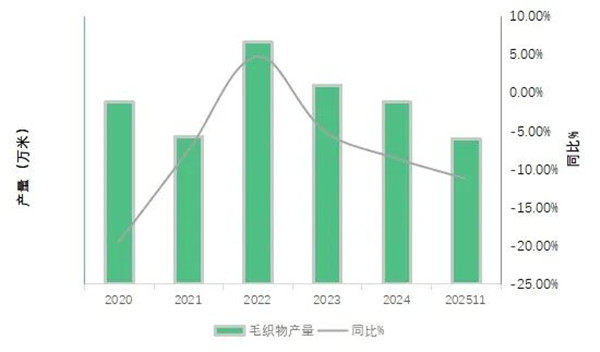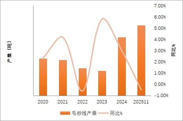 2025年,毛纺行业生产结构继续分化,主要产品产量随市场需求调整呈现差异化变化,产品结构在创新驱动下加速向高端化、功能化、绿色化升级。从产量变化来看,毛纱线与毛织物作为主要产品,2025年,毛纱线产量同比增长0.2%,毛织物同比下跌10.7%,跌幅较上半年收窄8.9个百分点。今年以来,毛纺行业的生产随着国际贸易氛围的波动而波动在内外市场的双重压力下,企业积极应对,寻求触底恢复。