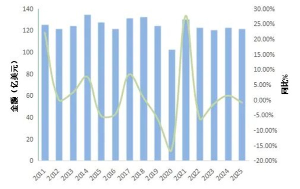 2025年,毛纺行业进出口市场逐步恢复,尽管受全球需求波动影响,进出口规模小幅调整,但市场结构持续优化,重点产品竞争力稳步提升。 据中国海关数据显示,2025年毛纺原料与制品出口额122亿美元(折合人民币871亿元),同比微跌0.9%,基本恢复至上年同期水平。