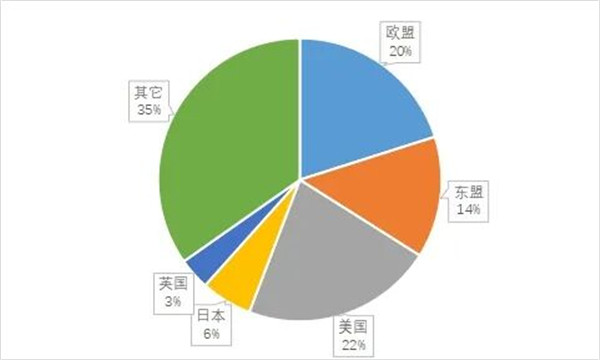 2011-2025年毛纺原料与制品出口额及同比变化情况资料 来源:中国海关 出口市场上,传统市场稳定,新兴市场扩容。2025年出口美国毛纺原料与制品金额占比21.8%,同比下跌3.3个百分点,依旧是我国毛纺产品最主要的出口目的地。出口欧盟毛纺原料与制品金额同比增长6.2%,占比增至20.1%。东盟市场份额进一步提升,成为拉动出口增长的新兴动力。
