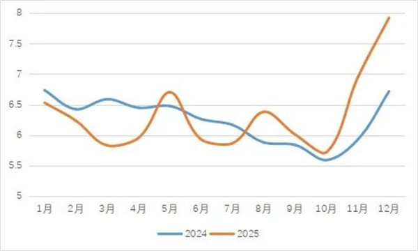 2025年毛纺原料与制品出口国家与地区出口额分布情况 资料来源:中国海关 在受全球羊毛供应及需求两头影响,四季度以来进口羊毛平均单价直线拉升,12月进口羊毛平均单价7.92美元/千克,环比增长14.1%,同比增长17.9%。