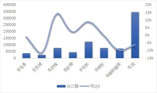 2025年主要毛纺产品出口额变化与同比情况(单价:万美元,%) 资料来源:中国海关