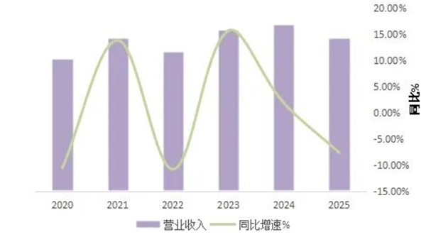 2020-2025年规模以上毛纺织及染整企业营业收入变化及同比情况(单位:万元,%)