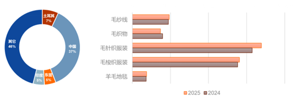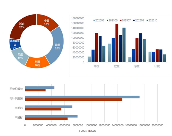 从左至右分别为:欧盟进口区外毛纺产品地区进口额份额;2024-2025年1-10月欧盟进口主要毛纺产品进口额情况(单位:欧元) 资料来源:欧盟统计局 聚焦全球产业链升级与标准接轨,共筑行业高质量发展新未来 2025年毛纺行业在挑战中坚守初心、在创新中焕发活力,产业链升级与全球布局的方向已然清晰。以产业链协同升级筑牢发展根基,以全球化布局拓展增长空间,毛纺行业在2026年继续谋求行业高质量新发展。 (来源:中国毛纺织行业协会) 声明:凡于本网文章前标有“CTEI网讯”之文章即表示为本网原创、编译、第一信息源、第一媒体合作方等,如需转载请务必标注文章来源自“中国纺织经济信息网 www.ctei.cn”,本网保留法律权利。