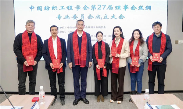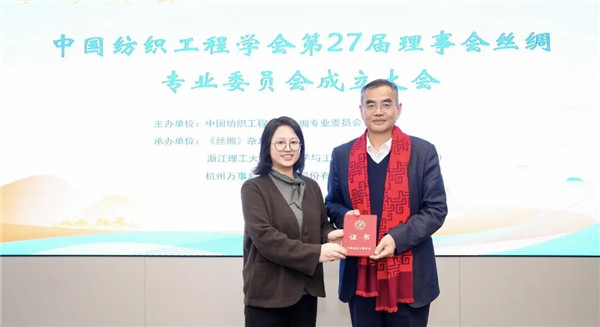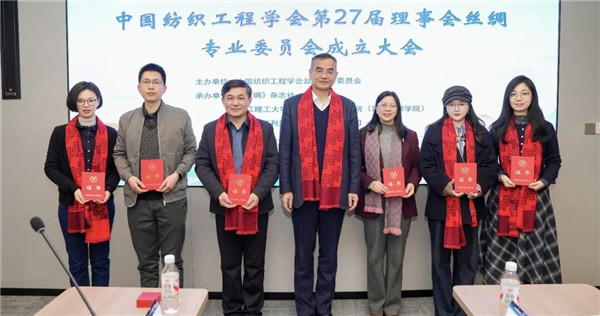 1月29日,中国纺织工程学会第二十七届理事会丝绸专业委员会成立大会在浙江杭州举行。丝绸相关领域高校、科研院所、博物馆、企业等单位代表逾50人参会。会议由浙江理工大学纺织科学与工程学院(国际丝绸学院)党委书记苏淼主持。 会上,中国纺织工程学会总工程师张洪玲宣读了《关于公布中国纺织工程学会第二十七届理事会丝绸专业委员会负责人名单的通知》。其中,浙江理工大学副校长姚菊明为主任,浙江理工大学纺织科学与工程学院(国际丝绸学院)党委书记苏淼、杭州万事利丝绸科技有限公司总经理马廷方、中国丝绸协会秘书长刘文全、辽宁省蚕业科学研究所副所长李喜升、广西科技大学院长林海涛、西南大学副院长蓝广芊、苏州大学教授潘志娟为副主任,中国纺织工程学会总工程师张洪玲为秘书长。 随后,张洪玲代表学会向丝绸专业委员会主任姚菊明颁发证书。姚菊明为秘书长、副主任、委员、副秘书长颁发证书。