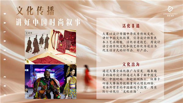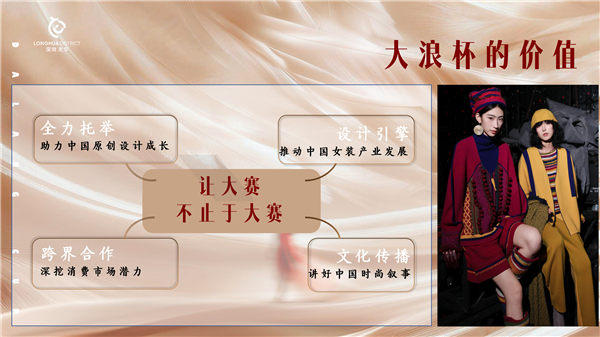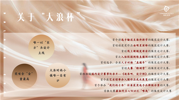 “大浪杯”中国女装设计大赛创办于2011年,由深圳市大浪时尚小镇发起,由龙华区政府与中国服装协会联合主办,至今已连续成功举办十四届。 大赛以“东方”为设计主线,凭借创新的赛制设置、丰厚的奖项激励、广泛的资源对接,成为具有行业影响力的专业赛事。 “大浪杯”中国女装设计大赛始终致力于助力中国原创设计成长,推动女装产业升级,累计吸引30余个国家及地区、300余所院校、300余家时尚企业的设计师参与,培养出包括中国时装设计“金顶奖”获得者在内的众多优秀设计人才。 同时,大赛通过跨界合作、文化传播等方式,深挖消费市场潜力,讲好中国时尚叙事,实现赛事价值的多元延伸。