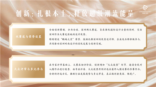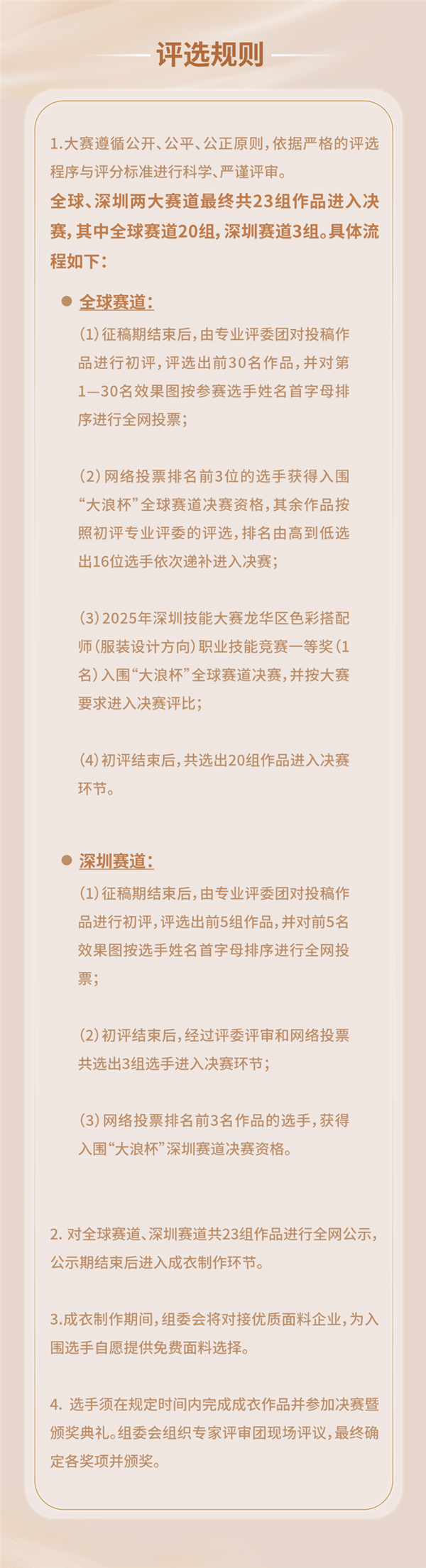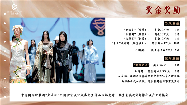规范参与赛事的步骤指引 精准审题,锚定创作方向:结合大赛背景与定位,选取自身擅长的角度进行创作,确保作品与主题高度契合。 选择赛道,明确参赛资格: ·全球赛道:面向全球服装设计爱好者,无地域限制。奖项设置为“金浪奖”(金奖)30万元、“浪潮奖”(银奖)20万元、“浪花奖”(铜奖)10万元,“十佳”设计师(优秀奖)及入围奖。 ·深圳赛道:参赛选手须在深圳当地工作、生活或学习,并提供相关证明。奖项设置为“鹏城之星”3万元及入围奖。 每组报名选手最多2人,同一作品仅限投递一个赛道,否则视为无效;两大赛道奖金均包含 20% 个人所得税,由组委会代扣代缴,选手获奖项目不重复累计。
