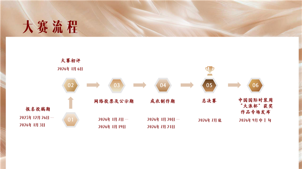 大赛初评于2026年4月6日举行,网络投票及公示期为4月7日至4月19日,成衣制作期为4月20日至7月24日,总决赛于7月底举办,获奖作品专场发布将于9月中上旬在中国国际时装周期间进行。 入围决赛的选手可享受组委会对接的优质面料企业免费面料支持,全球与深圳两大赛道获奖选手均可参与中国国际时装周专场发布及产业对接会。