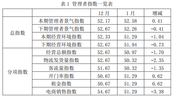 从管理者景气指数来看,总指数中,1月管理者景气指数为52.58,较上期上升0.41个百分点;经营环境指数为51.29,较上期下降1.04个百分点。 分项指数中,经营总额指数为50.97,较上期下降1.70个百分点;物流发货量指数为50.32,较上期下降2.35个百分点;客流量指数为50.32,较上期下降1.35个百分点;开门率指数为51.29, 较上期上升0.62;租金指数为51.29,较上期上升0.62个百分点;电商销售指数为51.29,较上期下降3.38个百分点。 2、商户景气指数下降1.22个百分点