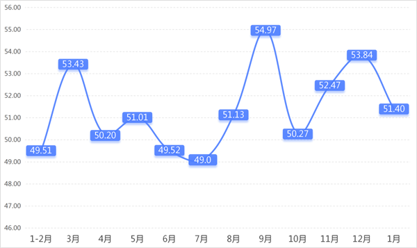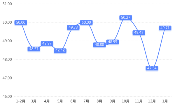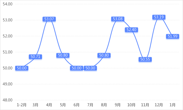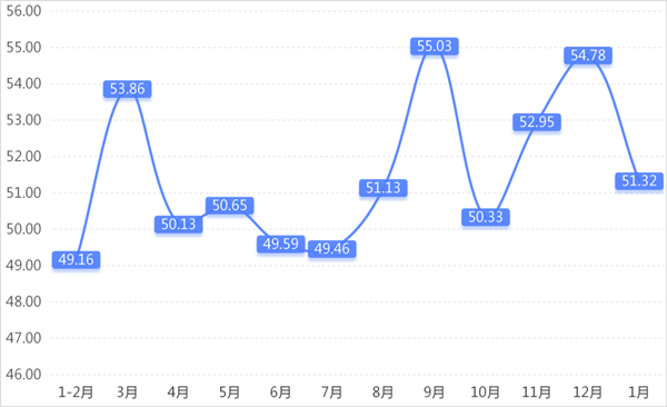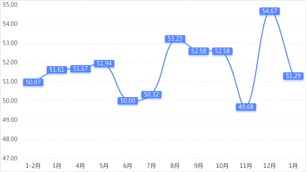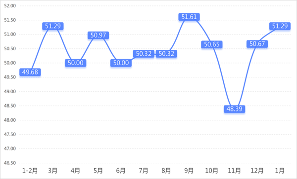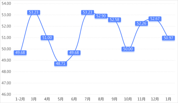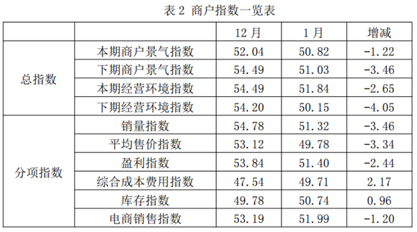 从商户景气指数来看,总指数中,1月商户景气指数为50.82,较上期下降1.22个百分点;经营环境指数为51.84,较上期下降2.65个百分点。 分项指数中,销量指数为51.32,较上期下降3.46个百分点;平均售价指数为49.78,较上期下降3.34个百分点;盈利指数为51.40,较上期下降2.44个百分点;综合成本费用指数为49.71,较上期上升2.17个百分点;库存指数为50.74,较上期上升0.96个百分点;电商销售指数为51.99,较上期下降1.20个百分点。