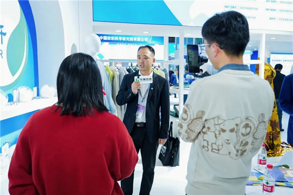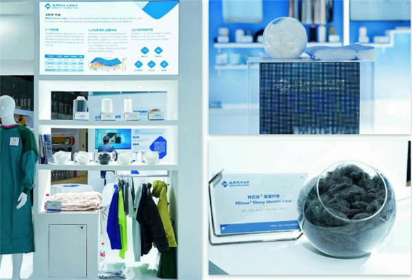 通用技术中纺院天津纺科 展出温特纶Winterless®保温纤维、稀贝丝®冰逸纤维和稀贝丝®墨暖纤维等差异化产品,运用纳米气凝胶改性、稀土材料复合等创新工艺,赋予纤维智能调温、高效隔热等新功能。