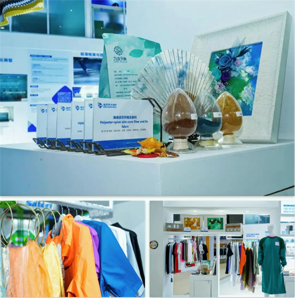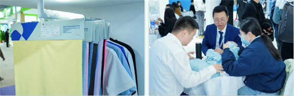 通用技术中纺院海西分院 携子公司福建海纺新材料科技有限公司展出仿生蜂巢微孔聚酯吸湿速干纤维、凉感遮热复合纤维、锦涤皮芯超级黑无尘纤维、聚乳酸抗菌复合纤维及其制品,以及护士服、工装厂服等15款新品。其中,凉感遮热复合纤维以“凉感+遮热+可染”三重优势,成为夏季功能性面料研发的亮点产品。