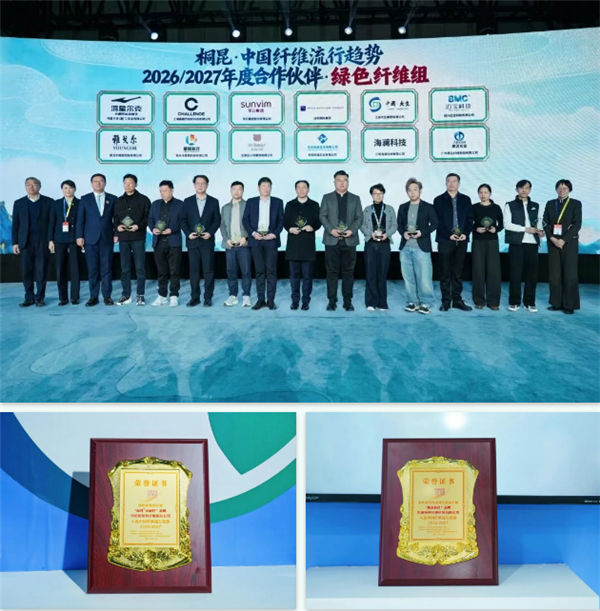 展会期间,通用技术新材展团喜讯频传,多项荣誉与战略合作签约仪式相继举行,充分彰显了行业对展团创新实力与品牌价值的高度认可。 荣誉加冕 在2026/2027中国纤维流行趋势发布活动中,通用技术新材东纶科技凭借在绿色纤维领域的卓越贡献与深度合作,荣获绿色纤维组“最佳合作伙伴”称号。同时,通用技术新材中纺绿纤“绿纤®安耐纤”阻燃型莱赛尔纤维与通用技术新材凯泰特纤聚乳酸/聚酰胺皮芯复合纤维两款创新产品成功入选2026/2027中国纤维流行趋势,标志着展团在差异化、功能性纤维领域的研发实力再获行业权威认证。
