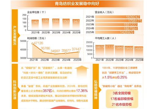 数据来源:青岛市工业和信息化局 走进山东青岛纺织博物馆,仿佛推开时光的阀门,步入百年纺织业的历史长廊。从民族纺织业的夹缝求生到新中国的蓬勃发展,这场跨越百年的“对话”,中国纺织工业脉络清晰,脉动可感。 发端于1902年的纺织业,被誉为青岛的“母亲工业”。从“上青天”辉煌,历经产业转型升级阵痛,再到破茧新生,青岛百年纺织筚路蓝缕,乘风破浪。近年来,青岛锚定数智化、绿色化、高端化,推动传统纺织产业焕新升级,产业规模与核心竞争力持续攀升,百年产业绽放时代新光彩,为全国传统产业转型提供鲜活实践。 百年厂房传承工业记忆 作为国内极具特色的纺织主题动线博物馆,青岛纺织博物馆坐落于青岛市市北区的纺织谷,经由原青岛国棉五厂旧址改造而来。没有大拆大建,而是在保留工业风貌的基础上,通过“一道、两廊、九厅、十八景”的空间布局,打造了丰富多样的展览,让游客沉浸式感受纺织文化。 博物馆以2.3万平方米的历史文化馆为主体,德式包豪斯锯齿形厂房的玻璃穹顶下,古力盖(井盖)、天平、机器机头等物件按序排列……一件件珍贵的工业遗产,让青岛纺织业的历史鲜活可感。 展厅里,一台1926年生产的自动换梭织布机前总围着不少参观者。这台机器运到博物馆时仅是一批零件,经老工匠手拼接还原,齿轮间仿佛还能听见当年的运转声。这件“镇馆之宝”见证了纺织技术从人工向机械化的跨越。 一台带有历史厚重感的细纱机,曾是全国劳动模范郝建秀亲手操作过的设备,镌刻着新中国纺织人的奋斗密码。 1951年,16岁的细纱女工郝建秀创造“郝建秀工作法”,将皮辊花率从1.5%降至0.25%,这项科学工作法在全国推广后,引发纺织行业的技术革新热潮。 “我1990年进厂,设备不断更新,但郝建秀的精神一直没丢。”青岛纺联控股集团有限公司综合管理部副部长、“郝建秀小组”第九任组长姜玲说。 如今,“郝建秀小组”通过“传帮带”培养出3名全国劳模、17名省部级劳模,21名市级劳模。青岛纺织博物馆也成为传承“母亲工业”文脉、弘扬“劳模精神、劳动精神、工匠精神”的重要载体。 精神传承,激发行业引领的力量,老工业基地织就新质生产力。而今,即发、酷特智能、雪达、前丰帽艺等龙头企业领跑行业,带动上下游配套企业协同发展,形成从纤维、织造、染整到成衣、品牌运营的完整产业生态,青岛的“中国针织名城”“中国童装名城”等金字招牌愈发闪亮。 老厂区变身“打卡”新地标 纺织谷是青岛市依托原青岛国棉五厂国家工业遗产的保护和活化利用打造的传统纺织产业就地转型升级项目,徜徉其间,传统与现代交融,沧桑和时尚共生。 纺织产业在这里升级—— “这款气凝胶摇粒绒注入航天隔热材料,保暖性是普通摇粒绒的3倍,还不起静电;雪花绒面料解决了浅色易透痛点,可机洗还实惠。”纺织谷商贸中心新零售业务部总监陈坤向客户介绍的热销品,正是老产业新升级的生动注脚。 在纺织谷红砖长廊的一处车间里,鸿天集团青岛鸿瑞轩服饰有限公司的全自动智能裁床正高速运转。这家2021年入驻纺织谷的企业是鸿天集团的核心技术研发中心。 车间内,员工们专注地操作着全进口缝纫设备,每人负责单件全流程制作,不同品类各有专攻。公司负责人李颖介绍,依托自研的集成化管理信息系统,企业全年研发款式超2000款,设计入选下单率高达75%以上,年订单业绩突破3亿元。 “纺织+”产业在这里融合—— 斑驳的厂房墙体上绘着时尚涂鸦,老旧的纺织机械改造成景观装置,曾经的生产车间变身艺术家工作室和手造工坊。历史廊道和时尚街区交相辉映,这里不再是一个传统的纺织产业园,而是集聚300余家企业、涵盖创意设计、时尚消费、科技服务等多元业态的新地标,成为市民游客休闲打卡、创意体验、学习充电的必选之地。 “我们定期举办各类展览、研学和时尚交流活动,吸引一拨又一拨年轻人来此打卡,来一趟百年工业的时光之旅。”青岛纺织谷相关负责人说。 青岛纺织谷致力于成为国家纺织服装集成创新平台、城市时尚生活体验中心和工业旅游目的地,百年老厂区正焕发蓬勃新生机。这片曾经以纱线连接世界的园区,恰恰以另一种方式织就产业融合新业态。 “母亲工业”迈向新征程 纺织业是青岛当之无愧的“母亲工业”,鼎盛时期占全市经济总量的75%以上。 “今昔对比,令人感慨。‘上青天’时代,青岛纺织业凭借规模优势和低成本劳动力,以大宗初级产品出口立足市场。如今,技术创新、品牌建设和绿色发展成为新的核心动能。”青岛市纺织服装行业协会秘书长郭瑞江说。 作为青岛纺织服装行业的链主企业,始建于1955年的即发集团,从发制品小作坊逐渐成长为年产值超过120亿元的国家级制造业单项冠军,正是青岛纺织产业转型升级的典型样本。 走进青岛市即墨区即发龙山工业园,10万纱锭智能纺纱项目展现着“智造”魅力。紧压的棉花包被自动化机器打散,高清摄像头精准识别并剔除棉籽、薄膜等杂质,纺纱清梳联、精梳、粗细联等环节全程自动化运行,高效有序的生产场景令人赞叹。 更具颠覆性的突破,来自超临界二氧化碳无水染色技术的产业化应用。“传统染色工艺对水资源高度依赖,每生产1吨纺织品,大约要耗费100吨淡水,水资源的消耗和污水的排放处理成为制约纺织业发展公认的难题。”即发集团