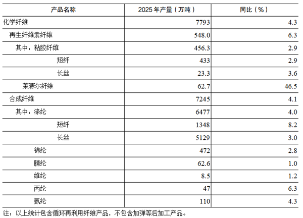 (一)子行业开工分化明显,产量保持平稳增长 2025年,化纤行业整体开工基本正常,但各子行业表现有所分化。其中,直纺涤纶长丝平均开工负荷约92%,较2024年提升1.29个百分点;粘胶短纤平均开工负荷约88%,较2024年提升2.55个百分点;锦纶平均开工负荷约81%,较2024年下降8.64个百分点,尤其下半年走低趋势更为明显;氨纶平均开工负荷约80%,较2024年下降3.85个百分点。 根据中国化学纤维工业协会统计,2025年化纤产量为7793万吨,同比增长4.3%(表1)。其中,涤纶产量增速4.0%,较2024年下降5.2个百分点,充分反映出龙头企业积极践行社会责任,认真贯彻执行中央综合整治“内卷式”竞争要求,主动减产以维持行业整体平稳运行;锦纶产量增速2.8%,较2024年下降3.5个百分点,由于阶段性供需不平衡,年内产量增速呈现阶梯性下滑趋势;氨纶产量增速4.3%,较2024年下降5.6个百分点。值得一提的是,莱赛尔纤维在技术和市场的双重推动下,在2024年产量增长27.4%的基础上,2025年又同比增长46.5%。整体来看,2025年化纤产量增速放缓,全年产量保持平稳增长。 表1 2025年中国化纤产量完成情况