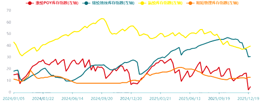 数据来源:中国化学纤维工业协会 库存方面,涤纶长丝受益于5月中旬企业集中安排停产检修,5、6月去库存加快,7月库存有所回升并在中旬达到26天(以POY为例),此后呈现震荡下降趋势,12月末降至5天,创下近五年来最好水平。锦纶库存大幅增加,虽然二、三季度减产幅度扩大,但仅是减缓了库存上升速度,10月10日达到高点47天,此后库存走低,12月末降至31天。氨纶库存则延续2024年下半年以来的高位震荡态势,上半年基本维持在50天左右;7月下旬库存出现下降趋势,12月末降至40天。 图1 2024~2025年化纤主要产品库存走势图
