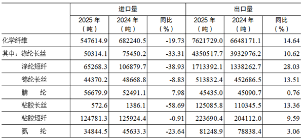 数据来源:华瑞信息 (二)终端需求内增外韧,整体压力有所显现 2025年,我国城乡居民收入实现平稳增长,国家协同推进促消费、惠民生政策落地显效,衣着消费扩容、提质、升级潜力持续释放,纺织品服装内销实现温和增长。国家统计局数据显示,2025年我国居民人均衣着消费支出同比增长2.2%;全国限额以上服装、鞋帽、针纺织品类商品零售总额突破1.5万亿元,同比增长3.2%。直播带货、即时零售等业态模式及渠道创新,国风国潮、运动户外、可持续时尚等产品及设计创新,带动纺织服装网络零售渠道增长平稳,全年网上穿类商品零售额同比增长1.9%。 外需方面,面对全球经济增速放缓、单边主义保护主义抬头、美国关税政策频繁调整的复杂形势,我国纺织行业迎难而上、适变作为,以供给创新、市场拓新、布局革新积极化解风险压力。根据中国海关数据,2025年我国纺织品服装出口总额为3121.8亿美元,同比下降2.5%,但仍连续第六年保持在3000亿美元以上,彰显较好发展韧性。其中,化纤、纱线、织物等纺织中间品出口实现较好增长,全年出口额同比增长1.8%;家用和产业用制成品竞争力较为稳定,但受对美国出口下滑影响,出口额同比略减少1.2%;受到关税扰动、需求疲弱等因素影响,服装出口压力更为突出,全年出口额同比减少5.1%。主要出口市场呈现多元分化态势,尽管对美国、东盟纺织品服装出口规模较2024年有所缩减,但对欧盟、英国、日本、加拿大等全球150多个贸易伙伴出口实现正增长。 从化纤直接下游来看,化学纤维纱、化学纤维短纤布产量分别同比下降10.02%、1.57%;从化纤下游主要行业(加弹、织机、涤纱)开机率来看,开工情况均不及2024年。其中,加弹平均开工率74%,较2024年下滑7.1个百分点;织机平均开工率63%,较2024年下滑6.44个百分点。四季度,“双十一”电商活动叠加天气降温因素,终端坯布面料出货情况向好,带动下游开工率小幅提升。从轻纺城成交量来看,全年成交量同比下降4.49%。 (三)化纤出口韧性凸显,全年实现较快增长 根据中国海关数据,2025年,化纤产品共出口762万吨,同比增长14.64%(表2),保持较好增长态势。其中,得益于国际市场需求增长,以及一季度抢出口、四季度印度取消BIS认证等利好,全年涤纶长丝出口累计达到435万吨,同比增长10.62%;前十大出口目的地中,出口印度、孟加拉国、印度尼西亚、巴西、巴基斯坦、墨西哥的增幅均在10%以上。 表2 2025年化纤主要产品进出口情况