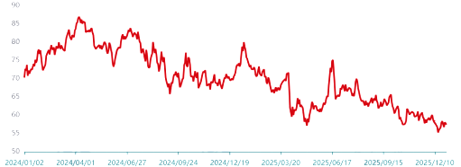 资料来源:中国海关 (四)油价波动中枢下移,化纤价格整体下行 2025年,全球经济增长放缓,导致市场对原油的需求大降,原油价格因需求不足而持续承压,全年WTI原油价格区间在55-80美元/桶,价格中枢低于2024年,总体处于下行通道(图2)。截至12月末,WTI原油价格下探至58美元/桶,较年初下降约20.76%。尽管原油价格整体走弱,但是局部出现过两次大涨的阶段性行情,以WTI原油价格为例,分别为1月中旬冲高至80美元/桶及6月中旬反弹至75美元/桶,背后主要推力是地缘政治冲突以及俄罗斯遭到制裁。 原料端支撑减弱叠加需求不足,化纤产品市场价格整体呈现不同程度的下降(图3)。以聚酯链产品为例分阶段来看,一季度纤维产品价格跌幅普遍大于原料跌幅,截至3月末,PTA价格降至4835元/吨,跌幅0.31%,涤纶POY价格降至6835元/吨,跌幅3.26%;二季度纤维产品价格虽上涨,但涨幅普遍不及原料涨幅,截至6月末,PTA价格涨至5030元/吨,涨幅4.03%,涤纶POY价格涨至7020元/吨,涨幅2.71%;三季度纤维产品价格虽处于下行趋势,但原料降幅更为明显,截至9月末,PTA价格降至4535元/吨,跌幅9.84%,涤纶POY价格降至6650元/吨,跌幅5.27%;四季度PTA价格小幅回升,挤压纤维产品盈利空间,截至12月末,PTA价格涨至5065元/吨,涨幅11.69%,涤纶POY价格降至6570元/吨,跌幅1.20%。 图2 2024~2025年WTI油价走势图