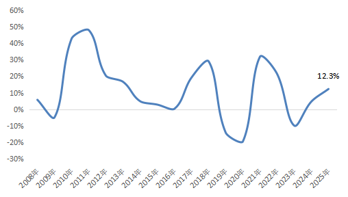 资料来源:国家统计局(*本表中纺织行业数据为三项合计) (六)技改驱动投资增长,产能结构进一步优化 根据国家统计局数据,2025年化纤业固定资产投资完成额(不含农户)同比增长12.3%,较2024年提升7.6个百分点。根据调研了解,行业投资增长主要来自存量产能的升级改造投入,包括旧生产工艺线智能化改造、长丝落筒自动化改造、冷水机组节能改造、余热回收制冷升级、光伏储能系统部署等绿色化、智能化项目。 图4 2008~2025年化纤行业固定资产投资增速变化