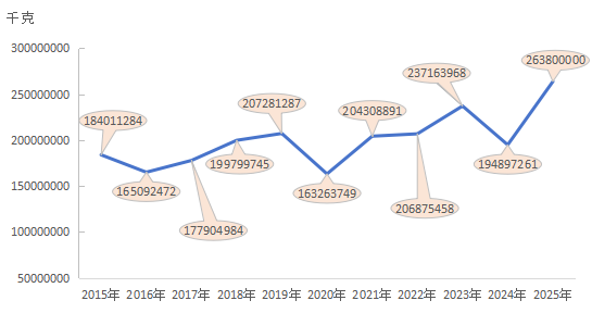 目前,麻纺织行业细分类别多(亚麻、大麻、黄麻、苎麻等)、体量小且“两头在外”格局尚未根本扭转,主要原料对外依存度依然很高,特别是亚麻原料的进口。根据中国海关统计数据,2025年中国亚麻纤维进口总计26.38万吨,创近10年进口新高,与2024年同比增加35.34%,其中亚麻打成麻进口17.59万吨,与2024年同比增加88.07%;亚麻短纤进口8.61万吨,与2024年同比减少12.87%。 出口方面,2025年包括纤维、纱线、织物及制品在内的麻纺织产品出口额与2024年同比下降15.23%,但对美国麻纺织产品出口额与2024年同比小幅增长1.72%。2025年麻纺织产品出口金额中,亚麻产品(含混纺)占比为92.80%,其中的亚麻制成品(含混纺)金额占比为12.72%,2024年该两项占比分别为93.55%和15.21%。按数量统计,2025年亚麻纱线和纯亚麻面料出口分别为1.98万吨和15770.53万米,与2024年同比分别增长10.87%和6.61%。 2025年麻纺织产品进出口具体分析如下。 (一)麻纺主要原料进口情况 1、亚麻纤维进口情况 尽管近两年国内亚麻种植面积有较大增长,但我国亚麻纤维依然主要依靠进口,并呈稳中有升态势,占比超过麻纤维(亚麻、苎麻、大麻、黄麻)进口量的80%。自2019年以来,除2020年和2024年两个特殊年份,其余年份进口数量都超过20万吨,2025年更是达到26.38万吨的最高纪录(见图3)。进口亚麻纤维中,打成麻和二粗的数量对比(以打成麻在二者合计中的占比为衡量指标)自2021年比2020年下降0.19个百分点为71.06%开始,连续下降到2024年的最低占比48.61%,2025年反弹至67.15%,但依然低于2021年3.91个百分点(见图4)。 图3 2015~2025年中国亚麻纤维进口数量统计