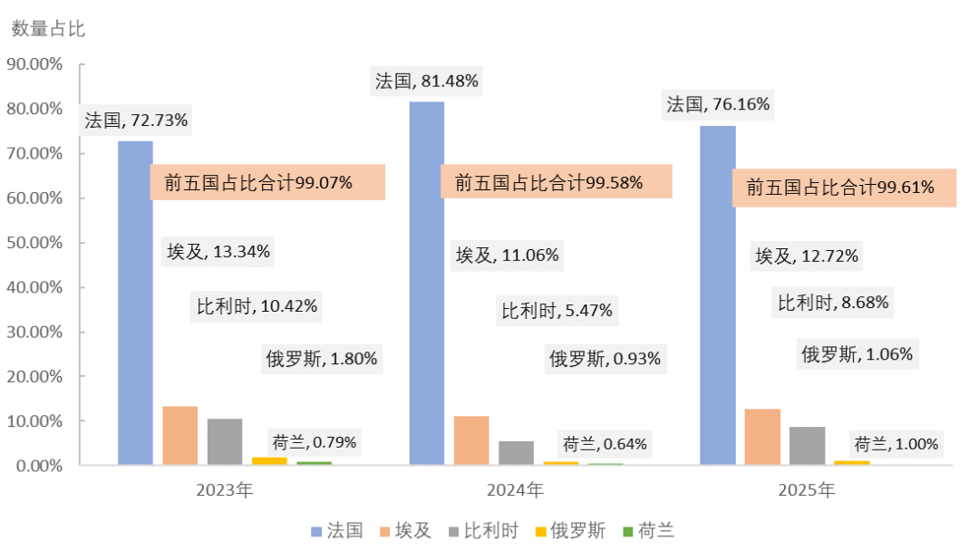 资料来源:中国海关 上述占比变化与亚麻纺织设备、科技和工艺水平提高带来的麻混纺/交织织物越来越多的市场表现相吻合。 (1)亚麻纤维进口国别情况 根据中国海关统计数据,2025年中国亚麻打成麻进口国别为法国、埃及、比利时、俄罗斯、荷兰、白俄罗斯、拉脱维亚、印度、英国9个国家,比2024年增加了2个,其中法国、埃及、比利时、俄罗斯和荷兰依序为中国亚麻进口前五位国家,合计数量占比超过99%,且各自占比有升降(见图5)。 图5 2023~2025年中国亚麻纤维进口数量前五国别统计