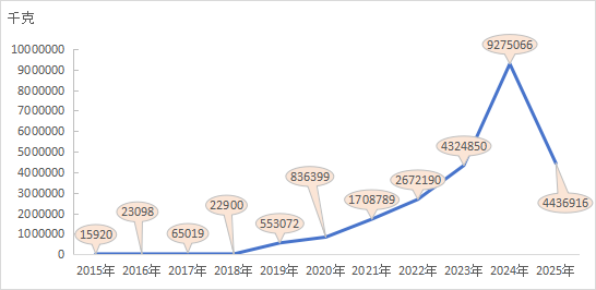 资料来源:中国海关 2023年欧洲亚麻歉收,原料大幅减产近50%。从图8 2023˜2025年中国自法国进口亚麻打成麻的价格变动中可以看出,打成麻价格从2023年1月的5.61美元/千克开始逐步上升,17个月后达到10.34美元/千克的最高价格。2024年下半年开始筑顶回落,2025年3月份达到3.88美元/千克的最低价格,降幅6.46美元/千克,成为近年来的最低点。随着国内市场爆发式增长,对原料的需求也快速增长,拉动亚麻价格的快速回升。至年底打成麻价格回升至6.80美元/千克的年内高点,增幅2.92美元,与2023年7月的价格相当。打成麻价格由最高到最低再反弹到中间价位,这18个月的时间段正是2024年欧洲亚麻丰收,2025年亚麻种植面积创新高的黄金期,结合2025年在国内亚麻种植面积翻倍的情况下我国亚麻纤维进口数量已然创历史新高的表现,目前以中国为主要市场的全球亚麻供需两旺形势正在出现。 2、汉麻纤维进口情况 根据中国海关统计数据,2025年中国汉麻纤维进口4437吨,比2024年下降52.16%(见图9),回落到比2023年小幅增长2.59%的水平。汉麻的主要进口国包括法国、俄罗斯、荷兰、乌克兰和比利时,其中自法国和比利时的进口数量占比分别为74.29%和3.26%,相对应的2024年占比分别为63.66%和19.73%(见图10、图11)。汉麻进口数量的锐减与2024年我国东北汉麻种植面积大幅增加以及2024年欧洲亚麻丰收有关。 图9 2015~2025年中国汉麻纤维进口数量统计