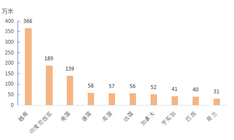 资料来源:中国海关 (3)对美国出口产品结构 2025年中国麻纺织产品对美国出口金额比2024年有1.75%的小幅增长,其中麻面料占比33.19%,麻制成品占比66.81%。在美国关税政策如此多变的情况下,对美出口仍有增长,一定程度上反映了美国市场对麻纺织产品的刚性需求。 2、其他麻纺织品出口 据中国海关统计数据,2025年除出口金额占比超过80%的亚麻纺织产品外,汉麻、苎麻和黄麻纺织产品的出口表现也有变化。 (1)苎麻纺织品 苎麻纤维是中国独有的韧皮植物纤维。2025年苎麻纱线、纯苎麻面料和苎麻混纺面料出口分别为330.3吨、786.57万米和559.66万米,与2024年同比分别增长17.16%、4.03%和29.20%,出口表现良好。其中,苎麻纱线主要出口国:韩国、日本、意大利、柬埔寨、罗马尼亚等;苎麻织物主要出口国:韩国、土耳其、荷兰、西班牙、多哥、意大利、柬埔寨、越南、印度尼西亚等。 (2)汉麻纺织品 2025年汉麻纱线和织物出口分别为347.5吨和209.84万米,与2024年同比分别下降30.4%和34.16%,一方面与2024年基数较高有关,也与汉麻产品国际市场需不温不火有关。其中,汉麻纱线主要出口到越南、印度、韩国、意大利、日本、土耳其等织造能力较强的国家,汉麻织物主要出口到柬埔寨、德国、越南、日本、斯里兰卡、韩国、印尼、孟加拉国等服装加工能力较强的国家。 (3)黄麻纱线和织物 2025年我国黄麻纱线和织物出口分别为3203.9吨和1444.6万米,与2024年同比分别下降2.00%和增长23.36%。黄麻纱线和织物主要出口国别见图13、图14。 图13 2025年中国黄麻纱线出口国别统计