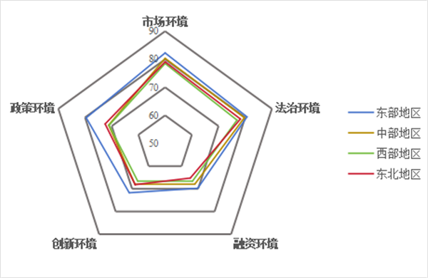 图1 各区域参评城市一级指标得分均值情况 企业发展韧性和信心增强。面对复杂严峻的外部环境和国内经济转型压力,中小企业积极应对、主动作为,在政策支持下,经营状况逐步趋稳。问卷调查显示,2025年营业收入、利润保持稳定或增长的企业占比较上年分别提升10.14和10.65个百分点;但受经营成本上涨等因素影响,利润增幅仍低于营业收入增幅。企业发展信心逐步恢复,未来一年计划创新研发的企业占比保持高位,有投资计划的企业占比较上年有所上升。其中,专精特新中小企业展现出更强的韧性和发展动力,其营业收入保持稳定或增长的企业占比达73.37%,比上年提升8.68个百分点;分别有63.56%、41.30%的企业未来一年有创新研发计划和投资计划。