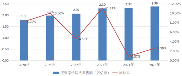 01 服装(B2C)网络零售额 国家统计局数据显示,我国网络消费延续向好向新的良好态势,2025年网上零售额15.97万亿元,同比增长8.6%,其中,实物商品网上零售额13.09万亿元,增长5.2%。根据中国纺联信息化部、流通分会测算数据,2025年,我国服装(B2C)网络零售额为2.38万亿元,同比增长2.59%(图1),占全国网络零售额(15.97万亿元)的14.90%。 图1 2020-2025年服装网络零售额