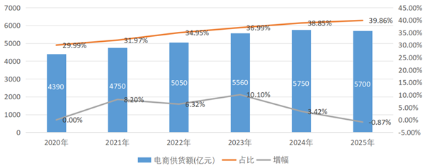 数据来源:中国纺联信息化部、中国纺联流通分会 2020-2025年,我国服装(B2C)网络零售额从1.80万亿元增长到2.38万亿元,年度增幅由2020年8.20%的中高速增长转为5%以下的中低增长。根据国家统计局数据,2025年,在实物商品网上零售额中,穿类仅增长1.9%,在各类消费品中增速较低。服装是电商传统优势品类,当前已进入线上渠道深耕与品质化发展的新阶段,在线上交易规模稳中有进的同时,开启了结构与模式的深刻调整。 02 专业市场渠道服装电商供货额 中国纺联流通分会测算,2025年,我国服装企业通过专业市场渠道为线上平台服装经销商家的供货额(包括电商商家组货)为5700亿元,同比下降0.87%(图2),占专业市场渠道服装总成交额的比重为39.86%。近年来,专业市场下游采购商结构发生深刻变化,线上卖家比重显著提升,模式逐年丰富,服装专业市场多渠道、多路径参与电商供应链分工,电商供货占比逐年提高,现已接近40%,显示线上供货与线下分销在专业市场的业务占比逐年接近。 图2 2020-2025年专业市场电商供货额