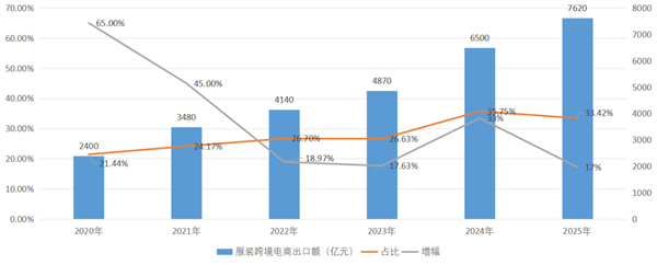 数据来源:中国纺联流通分会 03 服装跨境电商出口额 海关总署副署长王军在国务院新闻办新闻发布会上介绍:“据海关初步统计,2025年中国跨境电商进出口规模达2.75万亿元,比2020年增长69.7%。”根据比例测算,其中,跨境电商出口规模约2.3万亿元。近五年来,跨境电商成为我国出口贸易的重要增量,通过丰富品类、搭建平台、抱团出海、全球拓展等方式,始终保持着蓬勃发展的中高速增长态势。服装是我国跨境电商的首位品类,也是SHEIN、TEMU、Tik Tok Shop等龙头平台的重点品类。中国纺联流通分会测算数据,2025年,我国服装跨境电商出口额为7620亿元,同比增长17%,约占跨境电商出口额的33.42%。2020-2025年,我国服装跨境电商出口额分别为2400亿元、3480亿元、4140亿元、4870亿元、6500亿元和7620亿元,实现跨越式增长;服装在我国跨境电商出口额的占比也从2020年的21.44%提高到2025年的33.42%,服装品类影响力明显提升(图3)。 图3 2020-2025年服装跨境电商出口额