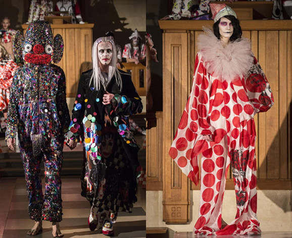 Bas Kosters今年的秋冬系列将“欢乐”的氛围放大,制造了马戏团的全套标准戏服加妆容。不仅有大嘴怪兽登台,还有“孕妇”踩高跟撩骚,更有不辨性别的印第安土著居民出来帅酷。