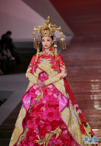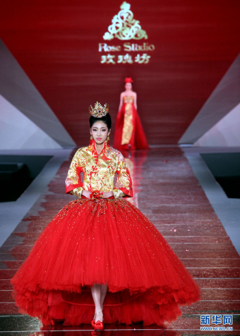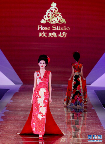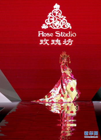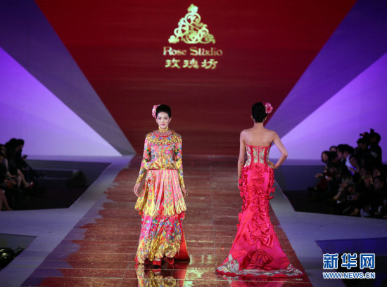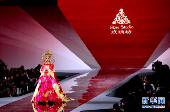 4月28日,在“中国时尚20年功勋人物”颁奖盛典上,模特在展示玫瑰坊高级时装。