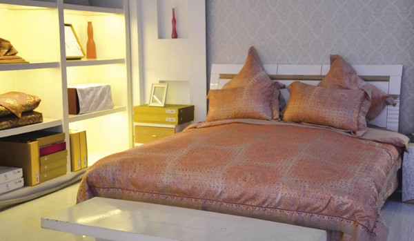 今年愉悦家纺不仅在床品的设计上运用了很多时尚流行元素,而且还在床品的织造中运用了一些高科技,用能够彰显自身个性的设计吸引年轻人的目光。“在印花、提花、刺绣工艺的基础上,愉悦家纺结合传统吉祥图案,在传统婚庆床品的设计中加入现代时尚的装饰元素,展现历史悠久的东方文化的同时,体现了时尚俏皮的现代文明,这种运用了创新后的传统花型设计的婚庆产品,买的人很多。”李娜说。