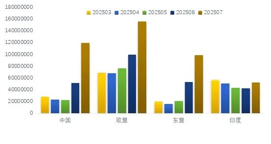2025年3~7月美国毛纺产品主要进口地区月进口额情况(单位:美元)