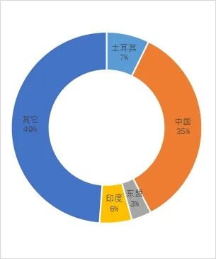 2025年1~7月欧盟毛纺产品主要进口国家地区份额情况(单位:欧元)