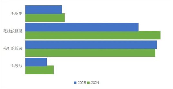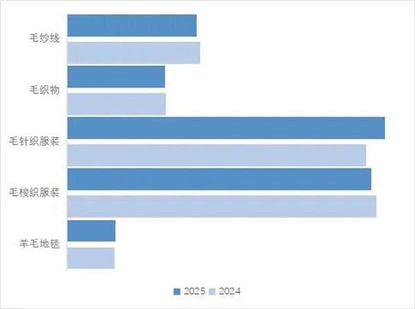 资料来源:欧盟统计局 2025年1~8月日本毛纺产品进口额1071亿日元(约合7.1亿美元),同比下跌7.8%,延续了近几年日本毛纺市场较为疲软的态势。两类最主要的毛纺产品均呈现调整和回落趋势,其中,毛针织服装进口额368亿日元,同比增速1.3%,增幅明显回调,毛梭织服装进口额317亿日元,同比下跌16.2%。 2024-2025年1~8月日本进口毛纺产品主要品类变化情况(单位:万日元)