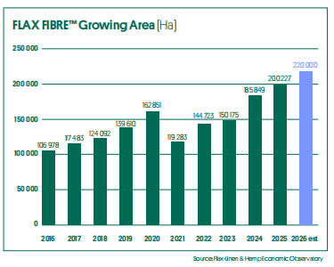 来自欧洲亚麻和大麻联盟的消息:虽然2026年的亚麻种植面积尚未确定,因春麻播种期尚未开始 。但根据国内生产机构的预测,以及2025年末冬麻的种植面积数据5.5万至6万公顷(上一年冬季仅为3万公顷),今年亚麻种植面积将大幅增加,估计总面积将接近22万公顷 ,而2025年为20万公顷,这将是连续第三年打破种植面积记录。相比而言 ,2015年西欧的种植面积尚不到10万公顷。 2016-2026年欧麻种植面积见下图