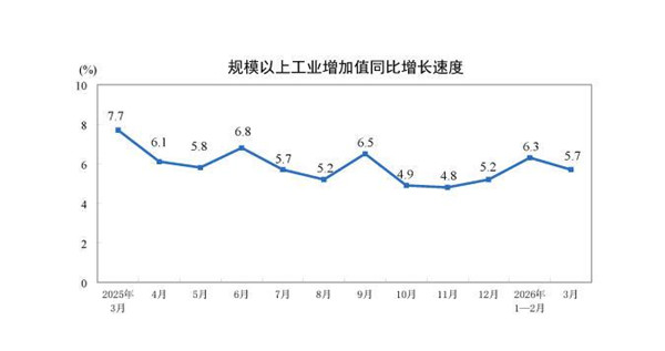 据国家统计局网站消息,3月份,规模以上工业增加值同比实际增长5.7%(增加值增速均为扣除价格因素的实际增长率)。从环比看,3月份,规模以上工业增加值比上月增长0.28%。1—3月份,规模以上工业增加值同比增长6.1%。