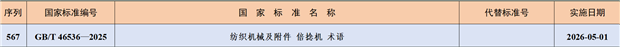 2025年10月31日,国家市场监督管理总局(国家标准化管理委员会)批准《紧固件 六角头螺杆带孔螺栓 第2部分:细杆B级》等758项推荐性国家标准和6项推荐性国家标准修改单的公告。其中,纺织机械领域的推荐性国家标准GB/T 46536-2025《纺织机械及附件 倍捻机 术语》批准发布,详情如下。