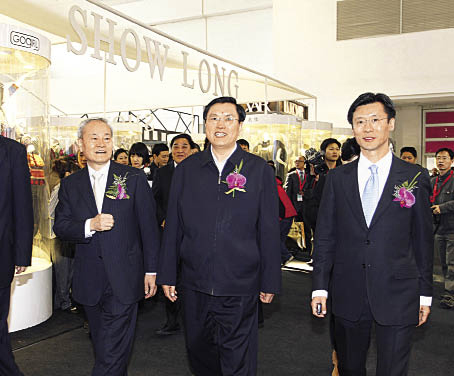 ↑2011年3月份,中共中央政治局委员、国务院副总理张德江(中)在中国纺织工业协会会长杜钰洲(左)等陪同下参观CHIC展。李涛 摄