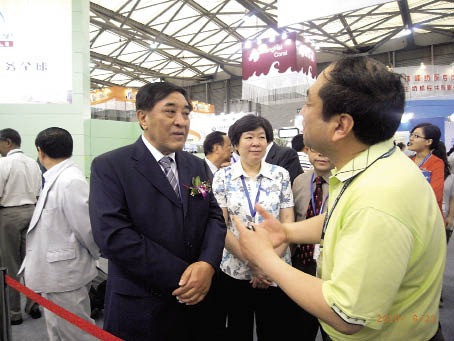 ↑中国纺织工业协会副会长许坤元(左二)参观2010中国国际纺织面料及辅料(春夏)博览会。李涛 摄